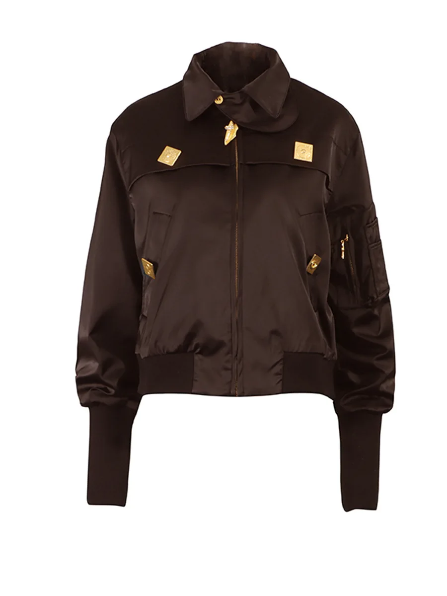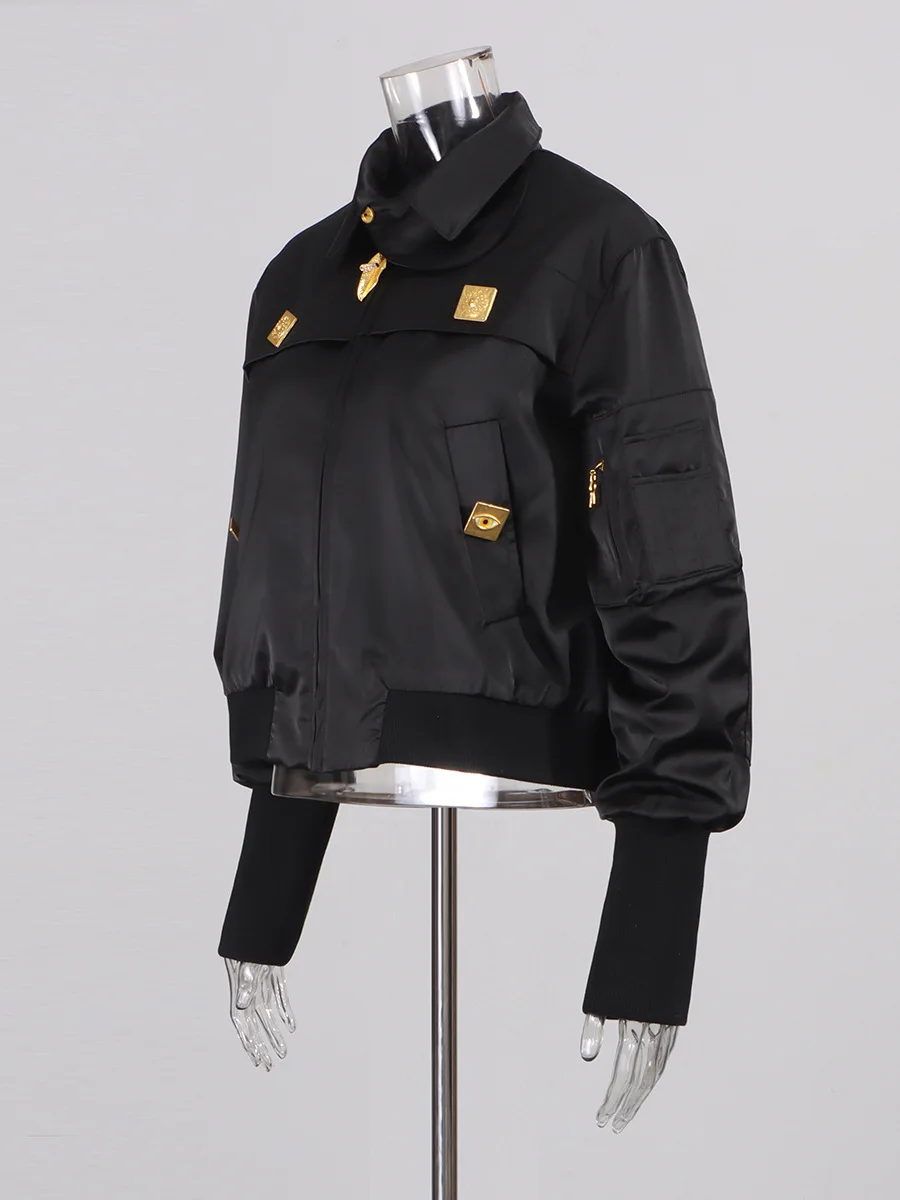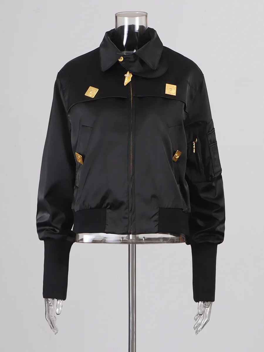Autumn Vintage Windbreaker Hooded Zipper Metal-Embellished Jacket Niche Designer Collared Zipper Cropped Women's Coat